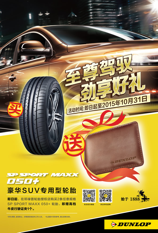 至尊駕馭 盡享好禮!購買兩條任意規(guī)格SP SPORT MAXX 050+輪胎,即贈高檔牛皮行駛證夾一個