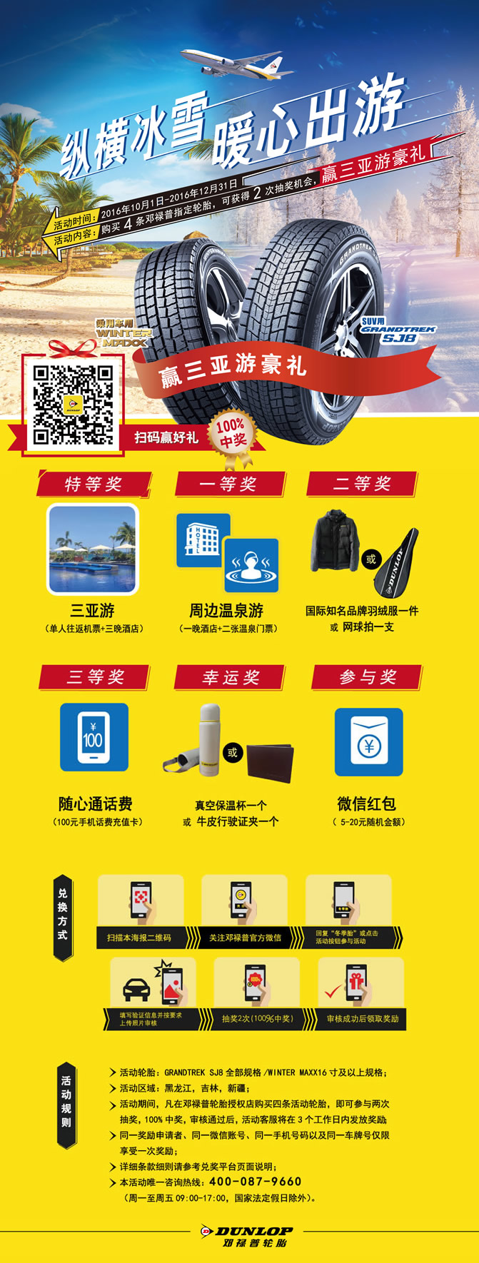 “縱橫冰雪 暖心出游” 購買4條指定輪胎,可獲兩次抽獎機(jī)會,贏三亞游豪禮!