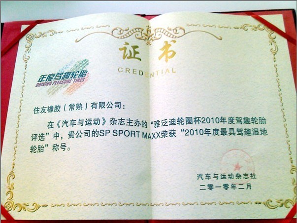 ??????? 2010年1月,鄧祿普參加了《汽車與運(yùn)動(dòng)》雜志主辦的“雅泛迪輪圈杯2010年度駕趣輪胎頒獎(jiǎng)典禮”。其中,鄧祿普SP SPORT MAXX輪胎榮獲“2010年度駕趣輪胎”稱號(hào)。