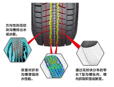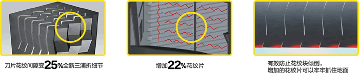 即采用立體式刀片花紋溝槽設(shè)計(jì),使花紋片溝槽間隙變薄25%,同時(shí)減少花紋片之間的間隙,目的是抑制花紋塊的傾倒。鋒利的溝槽邊緣能更好地抓住地面,同時(shí)也進(jìn)一步增加了輪胎和冰面的接觸面積,改善座駕直線(xiàn)行駛時(shí)的牽引力及彎道行駛時(shí)的穩(wěn)定性,讓您在征服嚴(yán)冬的路上操控自如。