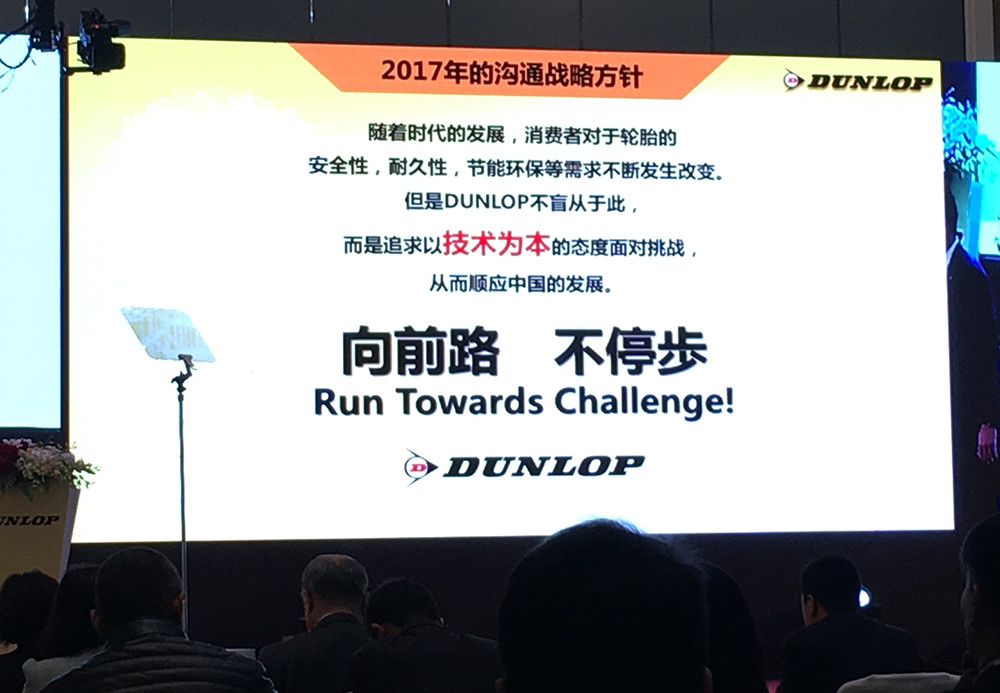 同時(shí),在本次大會(huì)上,鄧祿普輪胎提出了2017年全新的品牌宣傳語(yǔ) “向前路,不停步”(英文:Run Towards Challenge)。鄧祿普將秉承著這種精神,不斷向前,通過(guò)不懈的技術(shù)革新全面打造鄧祿普高新技術(shù)形象,用技術(shù)改變輪胎,向社會(huì)提供高技術(shù)含量的頂級(jí)輪胎產(chǎn)品。而品牌宣傳方面,鄧祿普品牌將延續(xù)2016年的方向,通過(guò)攜手目前中國(guó)各個(gè)體育領(lǐng)域中擁有不斷挑戰(zhàn)精神的佼佼者們, 向中國(guó)的消費(fèi)者傳達(dá)品牌自身積極面對(duì)挑戰(zhàn)的態(tài)度。