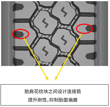 ■ 胎肩花紋塊之間設(shè)置連接筋,提升胎面整體剛性抑制胎面偏磨;