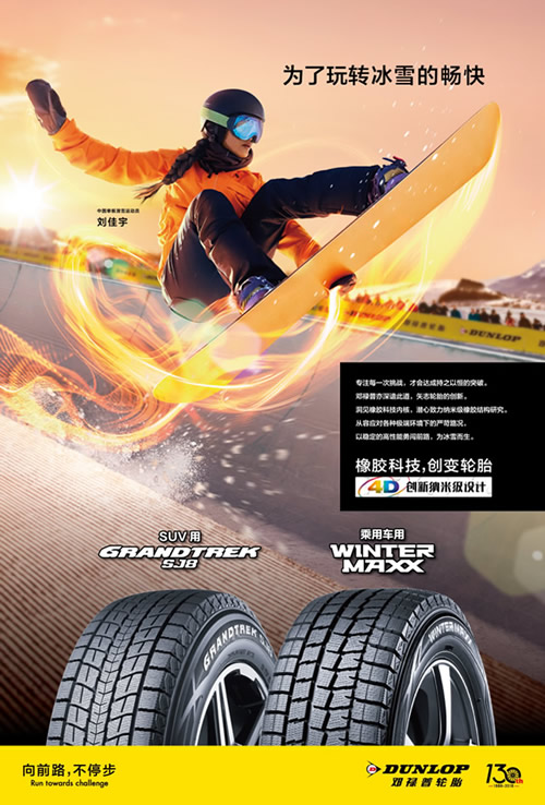 中國單板滑雪名將劉佳宇,在剛剛結(jié)束的平昌冬奧會上,劉佳宇以出色的表現(xiàn)斬獲單板滑雪女子銀牌,喜獲奧運(yùn)個人最好成績,也創(chuàng)造了中國運(yùn)動員在該項目上新的歷史,充分展現(xiàn)了無懼挑戰(zhàn)、不斷突破的精神,2018年鄧祿普繼續(xù)簽約劉佳宇擔(dān)任冬季輪胎產(chǎn)品的代言人,將充滿魔力的滑雪板與性能優(yōu)異的鄧祿普冬季輪胎建立起更加深度契合的聯(lián)系,共同詮釋“向前路,不停步”的品牌訴求。單板滑雪對技巧和控制力的要求極高,這也與鄧祿普冬季輪胎高安全性的產(chǎn)品訴求精準(zhǔn)吻合。