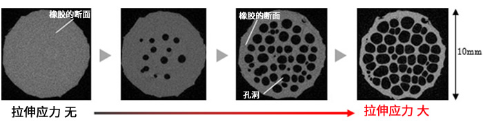 如果合成橡膠試驗品在受到垂直于金屬板方向上的拉伸力時,根據(jù)橡膠自身的特性,橡膠試驗品會向垂直于受力的方向收縮。然而,由于試驗品是被粘貼固定在金屬板上,所以受力時卻又無法自行收縮,結(jié)果致使橡膠膨脹,進而可以使我們通過CT直接觀察到橡膠內(nèi)部及其“孔洞”形成的過程。