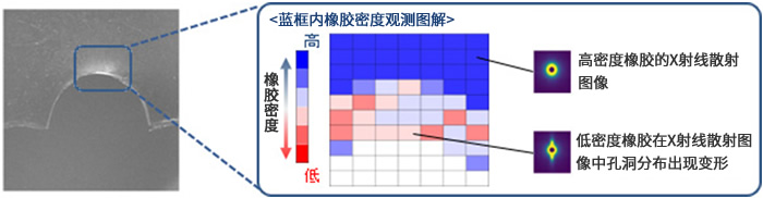 將帶有凹口的片狀合成橡膠試驗品沿水平方向拉伸,用X射線小角散射法觀察凹口頂點處橡膠內(nèi)部“孔洞”的形成和增大情況。