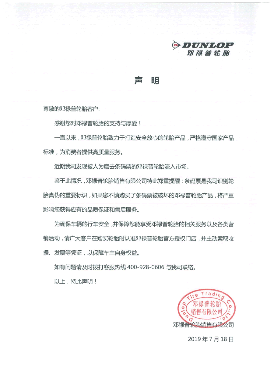 作為擁有百年歷史的全球領(lǐng)先輪胎品牌,鄧祿普秉持對消費者積極負責的市場宗旨,長期注重維護客戶自身權(quán)益。針對輪胎市場出現(xiàn)的亂象,鄧祿普輪胎向社會各界發(fā)出鄭重聲明,提醒廣大消費者在購買輪胎時,應(yīng)認準鄧祿普輪胎公司官方授權(quán)的門店進行購買,這樣才能充分保障消費者自身的合法權(quán)益,不予非法商家牟利空間,與社會各界共同維護健康有序的輪胎市場環(huán)境。