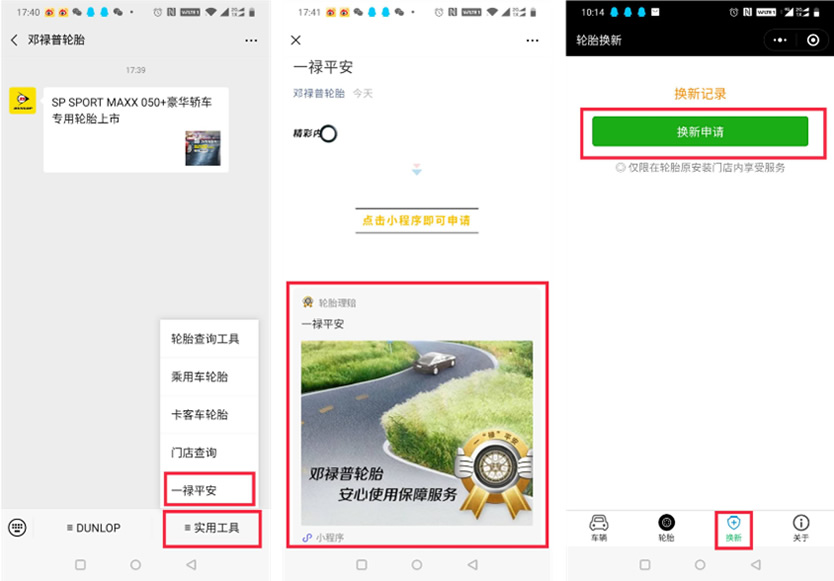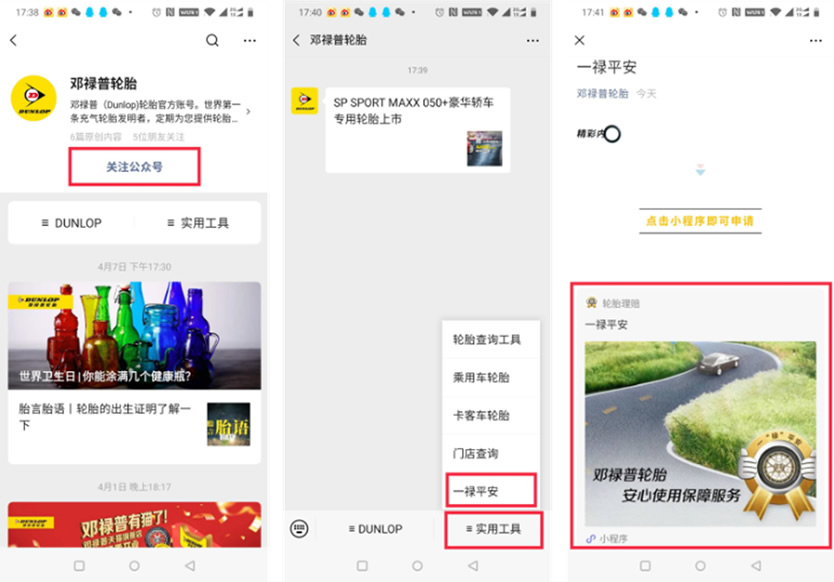 消費(fèi)者購買指定規(guī)格型號(hào)且滿足生產(chǎn)年周的輪胎產(chǎn)品后,進(jìn)入鄧祿普輪胎微信公眾號(hào),點(diǎn)擊菜單欄中的“實(shí)用工具”-“一祿平安”,點(diǎn)擊進(jìn)入內(nèi)頁后會(huì)出現(xiàn)“鄧祿普輪胎安心使用保障服務(wù)”小程序頁面,點(diǎn)擊進(jìn)入并按照步驟引導(dǎo)完成注冊(cè),即可完成一“祿”平安——安心使用保障服務(wù)的申領(lǐng)。
