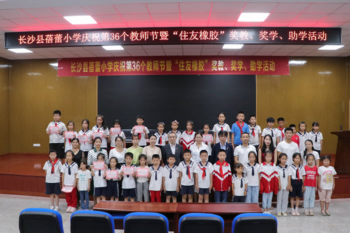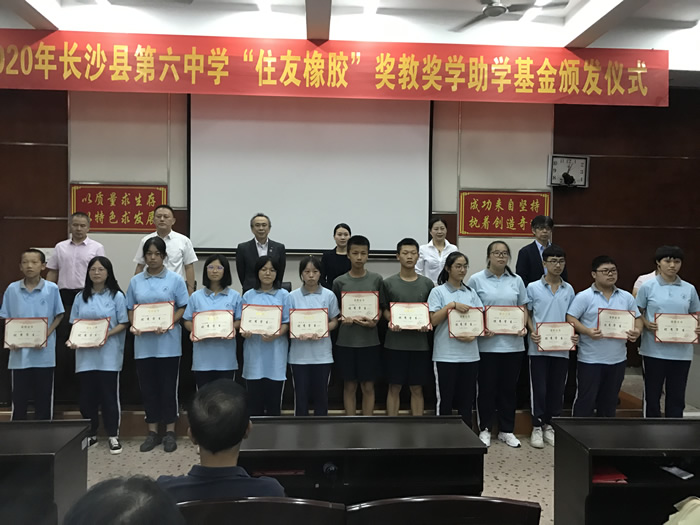 9月10日教師節(jié),住友橡膠(湖南)有限公司對(duì)長沙縣第六中學(xué)和長沙蓓蕾小學(xué)各捐贈(zèng)了獎(jiǎng)教獎(jiǎng)學(xué)基金,共計(jì)155名師生獲得獎(jiǎng)勵(lì)和資助。湖南公司總經(jīng)理舩原先生在頒獎(jiǎng)致辭中表示:“這場疫情,全國各地都在與其作斗爭,不僅有奮戰(zhàn)在一線的醫(yī)務(wù)警務(wù)人員,也有在座為防疫做貢獻(xiàn)的老師、克服困難努力學(xué)習(xí)的學(xué)生們。‘住友橡膠獎(jiǎng)教獎(jiǎng)學(xué)基金’的設(shè)立,旨在鼓勵(lì)潛心教學(xué)、精心培育青少年的各位老師,以及獎(jiǎng)勵(lì)奮發(fā)努力、品學(xué)兼優(yōu)的各位同學(xué)。”長沙縣第六中學(xué)和長沙蓓蕾小學(xué)全體師生,向住友橡膠(湖南)有限公司對(duì)發(fā)展當(dāng)?shù)亟逃聵I(yè)提供的支持及幫助表達(dá)了由衷的感謝。