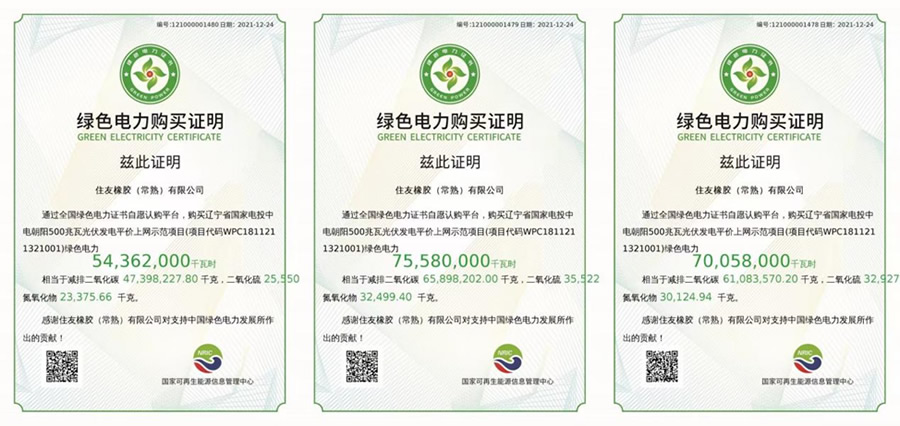 零碳未來,責(zé)無旁貸!住友橡膠以綠色可持續(xù)發(fā)展為己任,于近日完成350,000個綠證(共計3.5億度綠色電力)交易,一舉榮登綠證認(rèn)購平臺企業(yè)榮譽(yù)總榜榜首,成為目前我國綠證交易規(guī)模最大的認(rèn)購企業(yè)。住友橡膠此次取得的綠證分別用于常熟及湖南兩大生產(chǎn)基地,并已于2022年1月投入使用,標(biāo)志著住友橡膠本年度將完全實(shí)現(xiàn)使用綠色電力生產(chǎn)輪胎產(chǎn)品。另外此次取得的綠色電力,預(yù)計可達(dá)成住友橡膠自2022年1月-2023年6月約6個季度100%的綠電目標(biāo)。