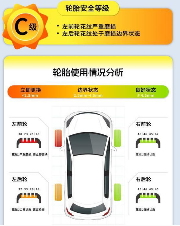 據(jù)輪胎花紋深度國家法定標(biāo)準(zhǔn)規(guī)定,輪胎花紋深度大于4.5mm被視為良好狀態(tài);2.5-4.5mm被視為臨界狀態(tài);一旦花紋深度低于2.5mm,輪胎便需要更換。值得注意的是,1.6mm為輪胎花紋的國家法定標(biāo)準(zhǔn),當(dāng)花紋深度達(dá)到極限值1.6mm時(shí),車輛必須立即更換輪胎,以確保行車安全。