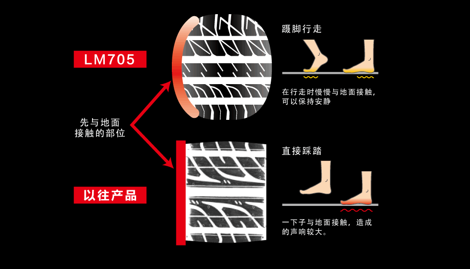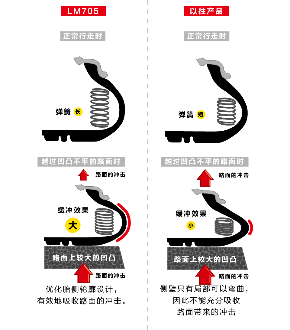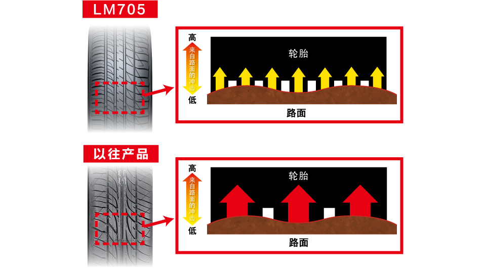 采用新技術(shù),對骨架(截面輪廓+胎面花紋)進行優(yōu)化,提升胎側(cè)和胎面的緩沖性能,從而抑制路面沖擊導(dǎo)致的輪胎震動,提升“駕乘舒適感”和“靜音效果”。