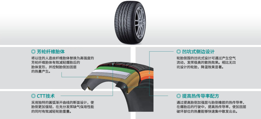 所謂缺氣保用輪胎是指在汽車行駛中出現(xiàn)穿刺,輪胎氣壓降到零時,仍然能夠以設(shè)定的速度行駛一定跑離的輪胎,它因?yàn)橥瑫r實(shí)現(xiàn)行駛時安全性能的提高以及取消備用輪胎帶來的資源和燃費(fèi)的節(jié)約這一環(huán)保性能而廣受矚目。目前已被許多車種使用,與汽車的進(jìn)步并肩而行的DUNLOP,從很早開始就著手對缺氣保用輪胎進(jìn)行研究,并成功實(shí)現(xiàn)實(shí)用化,技術(shù)實(shí)力得到公以。