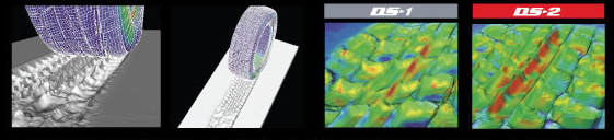 DS-1在冰面行駛時(shí),水在胎面四處橫流,形成細(xì)微水膜,導(dǎo)致打滑。與之相比,DS-2在橡膠表面設(shè)計(jì)了更為適度粗糙的微小凹凸,使得排水更為順暢,減少打滑的發(fā)生。